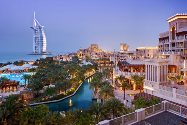 Al Quasr Hotel with Burj Al Arab at the Madinat Jumeirah Resort, Jumeirah Beach, Dubai, Emirate of Dubai, United Arab Emirates, UAE