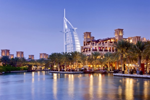 Souk Madinat Jumeirah with Burj Al Arab Hotel on Jumeirah Beach in Dubai, Emirate of Dubai, United Arab Emirates, UAE