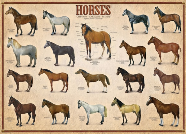 - This puzzle features a diagram of equine anatomy and 19 beautifully illustrated horse species, including the Friesian, the Arabian and the Percheron.