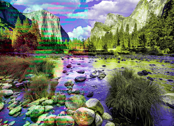A scenic view within Yosemite National Park. River, trees and mountains make up this breathtaking view sure to inspire the nature lover in all of us.