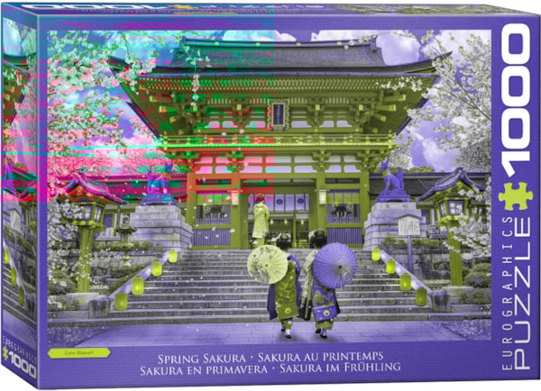 This stunning 1000-piece Eurographics puzzle, "Spring Sakura" by Lars Stewart, transports you to a vibrant springtime scene in Japan. The magnificent image features an ornate traditional temple, bathed in brilliant red and intricate architectural details, surrounded by an explosion of delicate pink cherry blossoms. Two figures, elegantly dressed in traditional attire and holding parasols, ascend the grand stone steps, adding a sense of peaceful movement to the serene landscape.