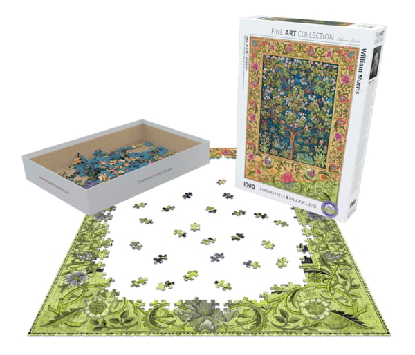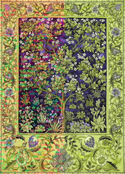 - The wall tapestry is woven in Belgium. The woven tapestry flaunts the artwork ‘Tree of Life- William Morris’. The artwork features a tree of Life design based on William Morris. It depicts a tree with an elegant and stylish blue green leaves among the flurry of activity of birds flying in the scene. The tree in the artwork symbolizes the eternal life, life force of nature and its energy.