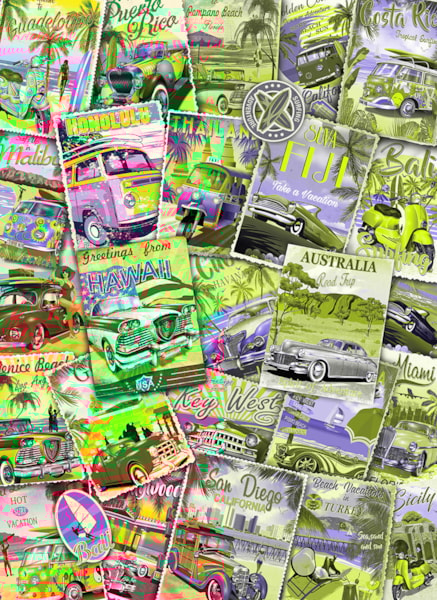 - A groovy vintage collage image celebrating travel in the retro van. A fun puzzle for any age.