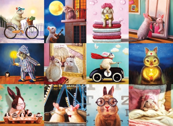 All the personalities of an adorable bunny are depicted in this image by artist Lucia Heffernan.