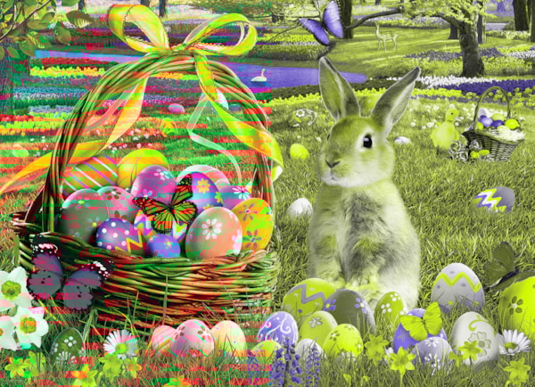 Celebrate the Easter holiday with this colorful spring puzzle. A cute bunny looks on over brightly decorated eggs in lush green yard. Two Easter baskets propped in yard holding eggs. Flowers are a bloom around pond.