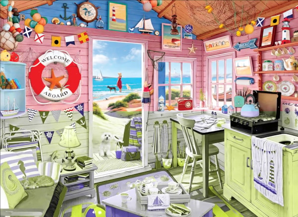 Escape to the serenity of seaside living with the Ocean Cottage 1000-Piece Puzzle by Eurographics, featuring artwork by the talented Ray Powers! This vibrant and charming puzzle transports you to a cozy coastal retreat, where nautical décor, colorful beach flags, and an inviting ocean view create the perfect seaside escape. From the playful pup to the charming tea set, every detail captures the warmth and tranquility of beachside life.