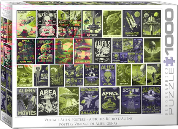 Dive into the retro-futuristic world of alien adventures with the Vintage Alien Posters 1000-piece puzzle by Eurographics. Featuring an eclectic collection of nostalgic sci-fi posters with bold designs and vibrant colors, this puzzle celebrates the imagination of extraterrestrial life and classic space exploration themes.