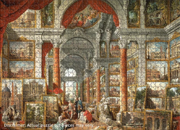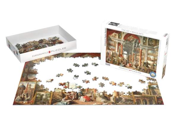 Bring the splendor of Rome to life with the Eurographics 1000-piece puzzle, Gallery of Views of Modern Rome, showcasing the exquisite artistry of Giovanni Paolo Panini. This intricate masterpiece captures the grandeur of 18th-century Rome, filled with majestic columns, stunning architectural landmarks, and an array of detailed cityscapes framed in an opulent gallery setting.