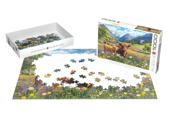Bring a breath of the Scottish Highlands to your table. This richly detailed scene by Leann Kate features a shaggy Highland cow and her curious calf standing amid a riot of wildflowers. In the distance, a mirror-calm lake reflects snow-tipped mountains, a cozy wooden cottage puffs chimney smoke, and more cattle graze along sunlit meadows.