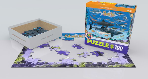 Dive into a world of incredible marine life with this Eurographics 100-piece puzzle. Designed for ages 5 and up, this puzzle showcases a stunning variety of sharks, each one labeled with its name. From the mighty Whale Shark to the speedy Thresher Shark, it's a fun and educational activity that will captivate any young ocean enthusiast.