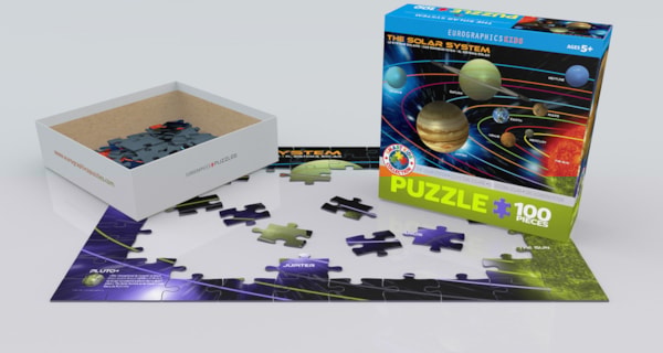 Embark on a cosmic journey with the Eurographics "The Solar System" 100-piece puzzle. This vibrant jigsaw puzzle beautifully illustrates our celestial neighborhood, featuring the sun and all eight planets in their orbits. Each planet is clearly labeled, providing an engaging and educational experience as you assemble this stunning astronomical display.