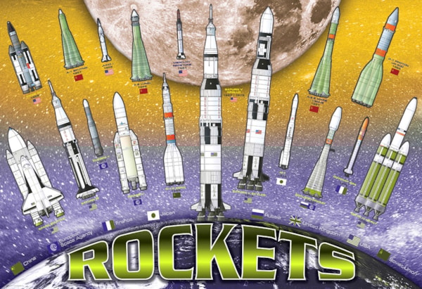 Blast off into space history with the Eurographics "Rockets" 100-piece puzzle. This captivating jigsaw puzzle features a comprehensive collection of iconic rockets and spacecraft from around the world. Each detailed illustration is identified by name and nation, offering an engaging and educational journey through space exploration history.