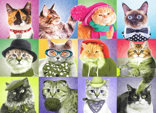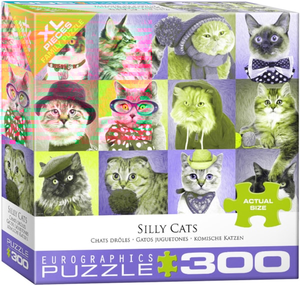Step into a world of whiskers and whimsy with Silly Cats, a vibrant 300-piece puzzle from Eurographics. Featuring twelve fashionable felines dressed in bow ties, hoodies, hats, and glasses, this colorful grid is packed with attitude and charm. Each kitty brings its own purr-sonality, making this a fun and lighthearted puzzle for cat lovers of all ages.