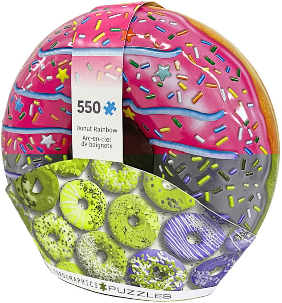 Indulge in a delightful puzzle experience with the Donut Rainbow Tin by Eurographics. This 550-piece jigsaw puzzle features an array of vibrant, mouth-watering donuts decorated with colorful sprinkles, icing, and fun toppings.