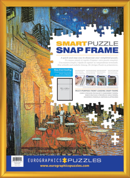 - Frame already assembled. Holds a standard 19.25 x 26.6 inch puzzle. Color gold frame.