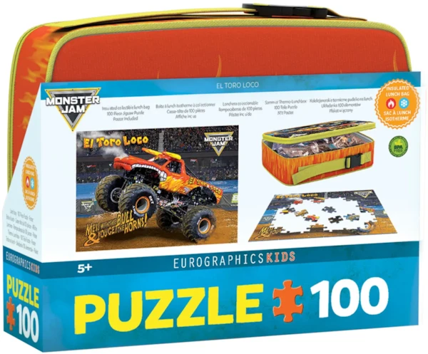 Feel the heat with the El Toro Loco Monster Jam 100-Piece Puzzle and Lunch Bag by Eurographics! Featuring the fiery and fearless El Toro Loco monster truck, this exciting puzzle is sure to thrill young Monster Jam fans. With 100 pieces to assemble, kids will love building this high-energy scene of their favorite truck tearing up the stadium with roaring power.