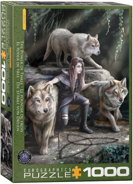 Ce casse-tête fascinant de 1000 pièces Eurographics de la collection Anne Stokes, intitulé "Le Pouvoir de Trois", vous transporte dans un royaume forestier mystique. L'œuvre d'art captivante présente une puissante figure féminine aux longs cheveux flottants, accompagnée de trois loups majestueux qui dégagent force et loyauté. Sur fond d'arbres anciens et de lumière éthérée, la scène évoque un sentiment de magie ancienne et de connexion profonde avec la nature.