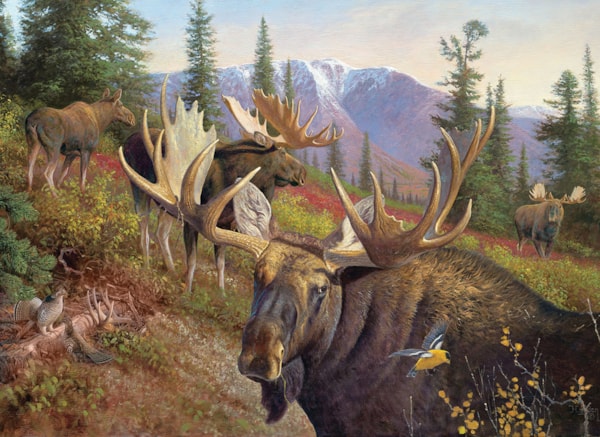 L'artiste Hayden Lambson peint plusieurs orignaux majestueux broutant dans un pâturage de montagne.