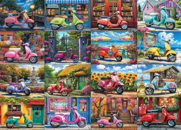 Faites un voyage dans un monde de couleurs vives et de charme rétro avec le casse-tête de 1000 pièces 16 Scooters d'Eurographics, illustré par les talentueux Bigelow Illustrations ! Ce puzzle captivant met en scène 16 scooters magnifiquement détaillés, chacun situé dans des paysages pittoresques et variés : des plages ensoleillées aux rues de villages charmants, en passant par des champs de tournesols en fleurs et des cafés européens confortables. Chaque scooter se distingue par sa couleur, son style et son décor uniques, offrant une agréable balade à travers différentes saisons et endroits pittoresques.