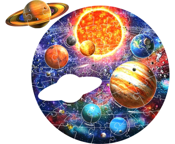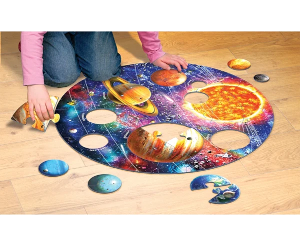 Partez à la découverte avec Espace cosmique — casse-tête géant de plancher de 58 pièces, collection Smart Kids! La grande scène circulaire présente les planètes identifiées, des comètes et des étoiles, avec des découpes en forme de planètes à soulever et à insérer. Les grosses pièces robustes sont parfaites pour les petites mains et favorisent l’observation, la motricité fine et l’intérêt pour les sciences. Format assemblé : env. 28 po × 28 po (71 × 71 cm).