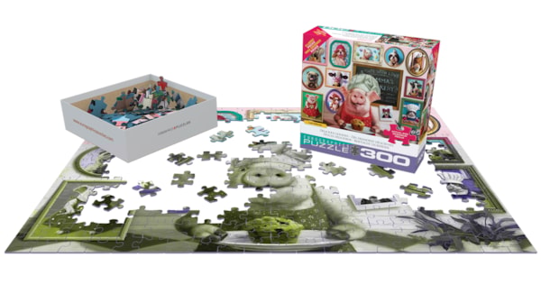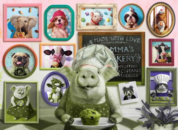 Plongez dans l’univers gourmand de Délicieuses Friandises, un casse-tête de 300 morceaux signé Eurographics. Avec un cochon joyeux en cuistot et une galerie amusante de portraits d’animaux, cette scène colorée déborde de charme.