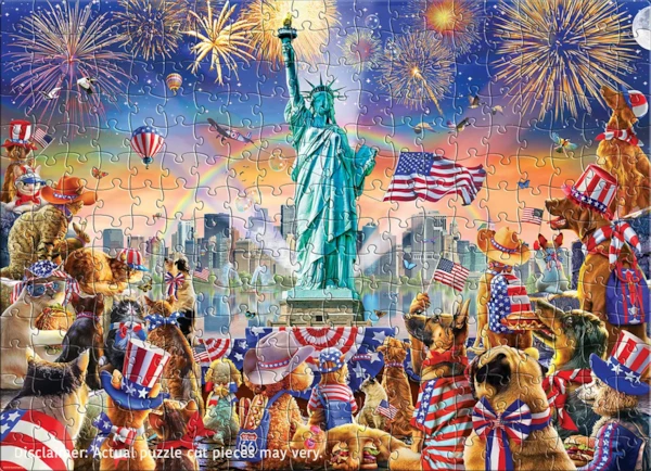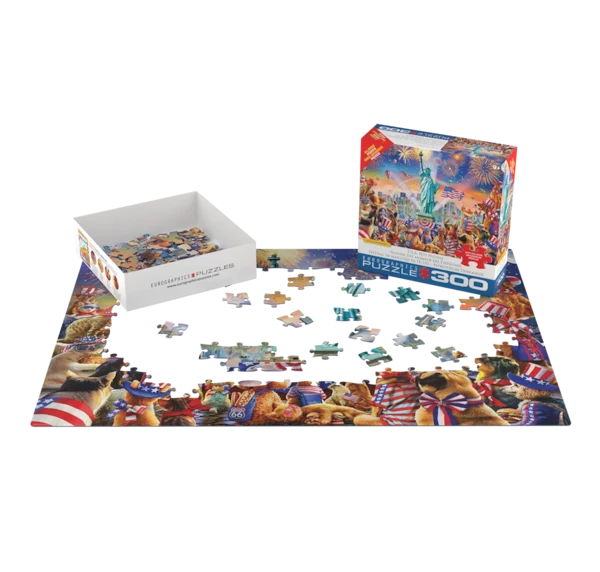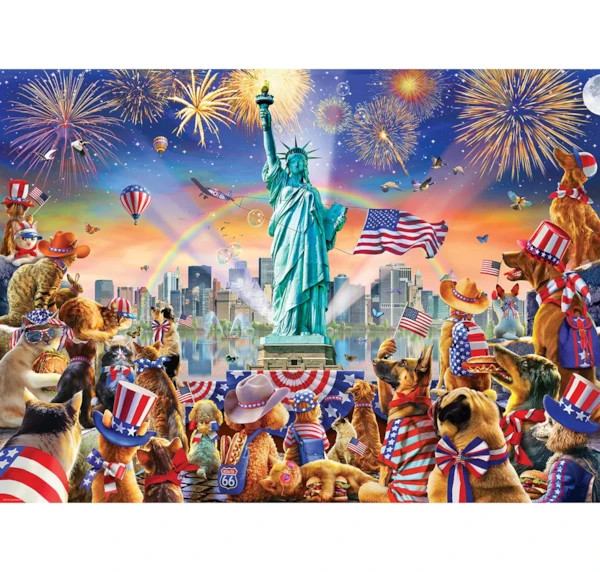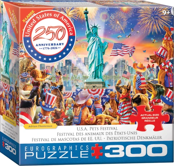 Participez à la fête avec U.S.A. Pets Festival, un casse-tête XL de 300 grandes pièces conçu pour souligner le 250e anniversaire des États-Unis d’Amérique (1776–2026). Cette scène joyeuse et attendrissante met en vedette une foule d’animaux adorables vêtus de rouge, blanc et bleu, réunis devant l’emblématique Statue de la Liberté.