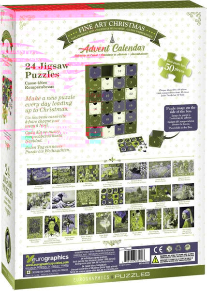 Découvrez la magie des fêtes avec le Calendrier de l'Avent Fine Art Christmas! Cette collection unique propose 24 mini-puzzles de 50 pièces chacun, mettant en avant des chefs-d'œuvre des artistes les plus emblématiques au monde. Derrière chaque tiroir, découvrez des œuvres magnifiques comme "La Nuit étoilée" de Van Gogh ou "La Joconde" de Léonard de Vinci.