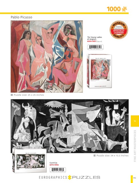 1000 Pablo Picasso The Young Ladies of Avignon 6004-5851 (Square) Puzzle size: 25 x 25 inches 10 FINE ART MASTERPIECES Puzzle size: 34 x 15.5 inches Guernica 6015-5906 6 2 8 1 3 6 6 5 9 0 6 2 195