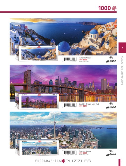 1000 4 PANORAMIC COLLECTION Santorini Greece 6010-5300 6 2 8 1 3 6 6 5 3 0 0 8 Poster: 2390-5300 Brooklyn Bridge, New York 6010-5301 6 2 8 1 3 6 6 5 3 0 1 5 Toronto, Canada 6010-5303 6 2 8 1 3 6 6 5 3 0 3 9 Poster: 2390-5303 73